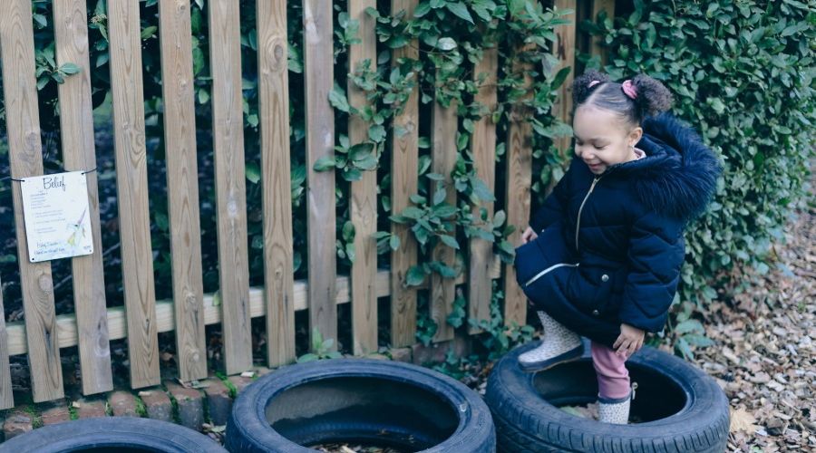 Tucked away is our secret garden; a calming space with a canopy, where our children build dens, play with natural materials, and enjoy peaceful moments in nature. Open-ended resources like crates, hosepipes, and steering wheels spark creativity and problem-solving through child-led play.